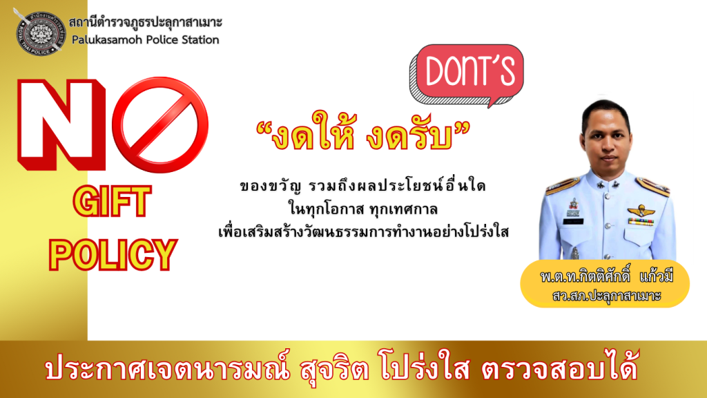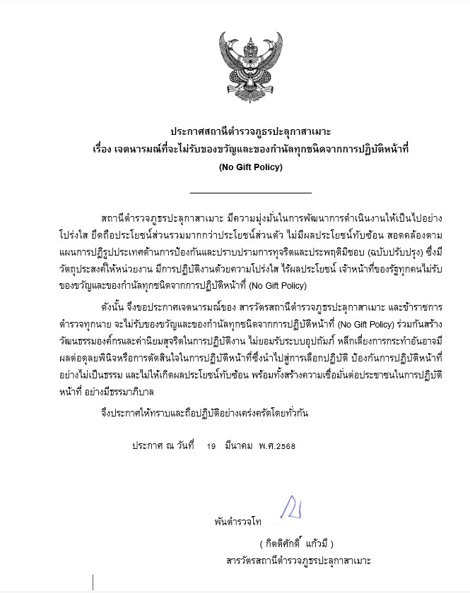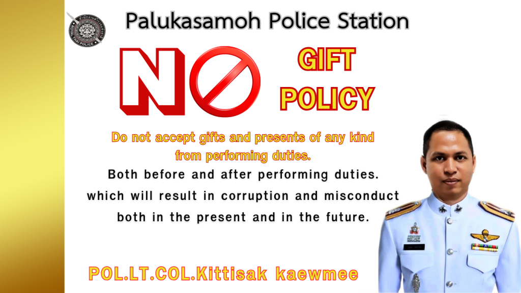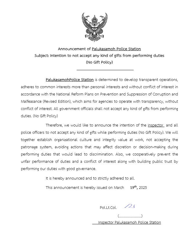 - ประกาศสำนักงานยุทธศาสตร์ตำรวจเรื่องเจตนารมณ์ที่จะไม่รับของขวัญหรือของกำนัลทุกชนิดจากการปฏิบัติหน้าที่