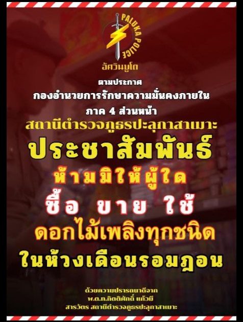 สภ.ปะลุกาสาเมาะ จึงได้ประชาสัมพันธ์ขอความร่วมมือจากพี่น้องประชาชนในพื้นที่ตำบลปะลุกาสาเมาะ งดเว้นการซื้อ ขาย ใช้ดอกไม้เพลิงทุกชนิด ในห้องเดือนรอมฎอน เพื่อเป็นไปด้วยความเรียบร้อย และลดเหตุการณ์รบกวนที่ส่งผลกระทบต่อความมั่นคงในจังหวัดชายแดนภาคใต้ในห้วงเวลาดังกล่าว
