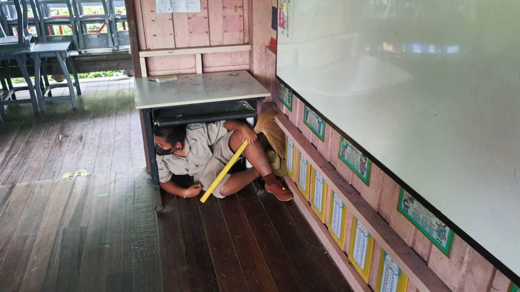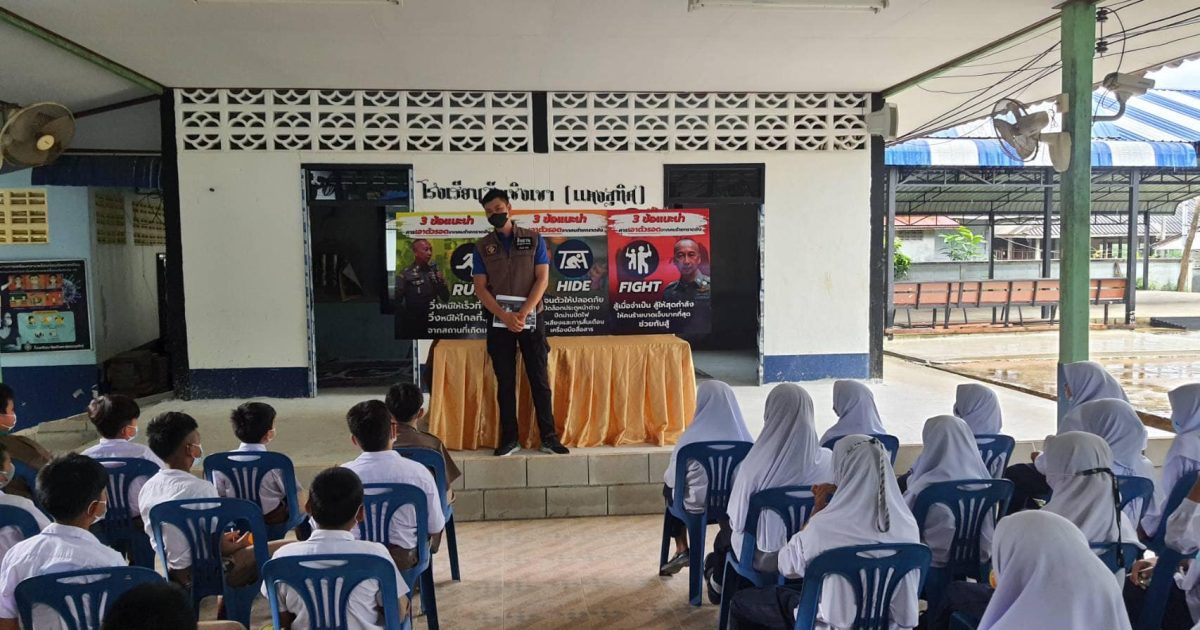 พร้อมประชาสัมพันธ์และแนะนำวิธีเอาตัวรอดให้กับเด็กนักเรียน และผู้ดูแล ในด้านการป้องกันตนเอง หากมีสถานการณ์ที่อาจกระทบต่อชีวิตและทรัพย์สิน ตลอดจนวิธีเอาตัวรอด เมื่อตกอยู่ในสถานการณ์ที่คับขัน ไม่ปลอดภัย (อาทิเช่น เหตุ Active Shooter บุคคลคลุ้มคลั่ง วิกลจริต หรือเหตุการณ์ที่อาจเป็นอันตราย หรือกระทบต่อชีวิตและทรัพย์สิน) โดยยึดหลัก Run Hide Fight “หนี ซ่อน สู้”ตามแนวทาง และ นโยบายของสำนักงานตำรวจแห่งชาติ