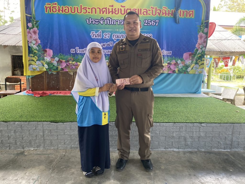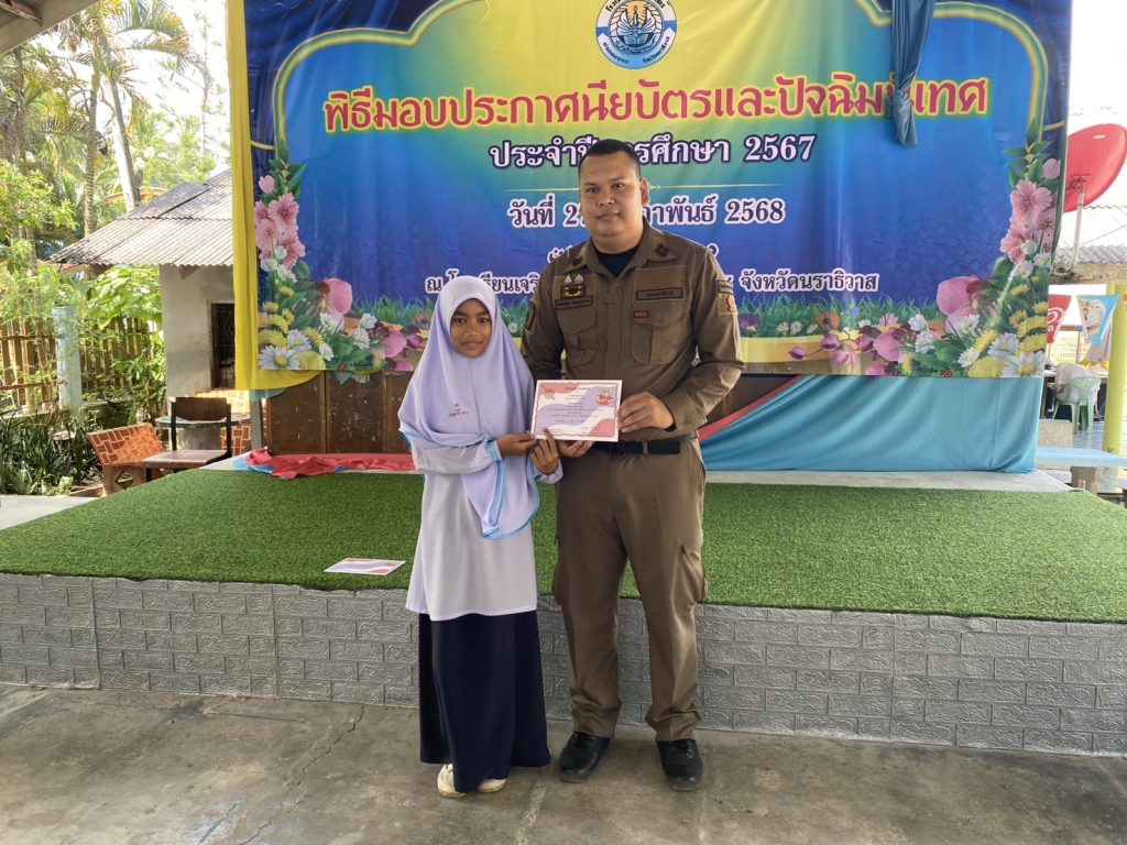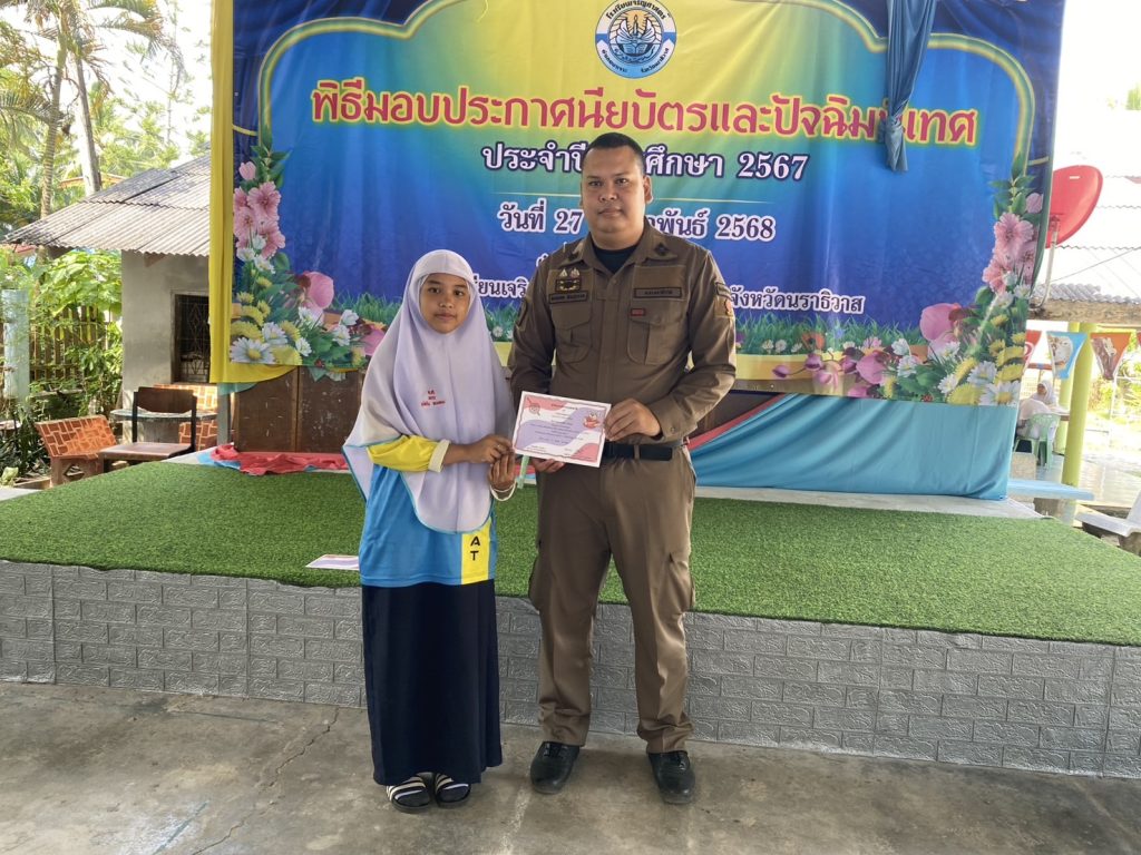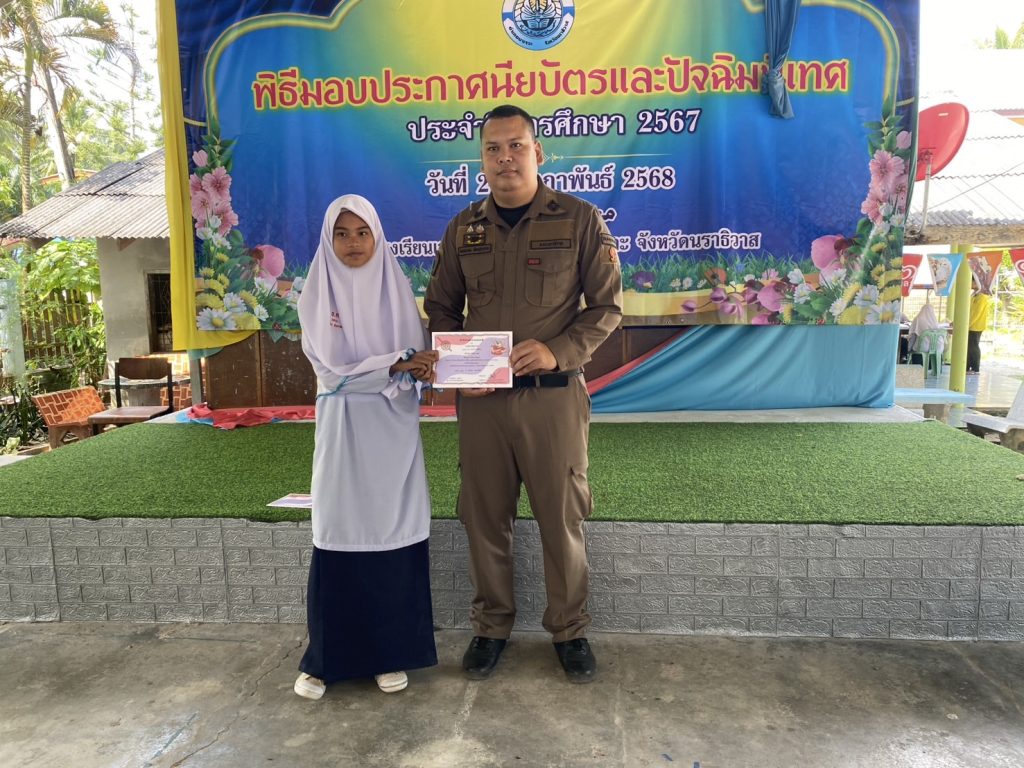 มอบประกาศนียบัตรโครงการการศึกษาเพื่อต่อต้านการใช้ยาเสพติดในเด็กนักเรียน D.A.R.E. ประจำภาคเรียนที่ 2 ปีการศึกษา 2567 และมอบทุนการศึกษาให้กับนักเรียนที่เขียนเรียงความดีเด่น ให้กับเด็กนักเรียน โรงเรียนเจริญศาสตร์ ต.ปะลุกาสาเมาะอ.บาเจาะ จว.นราธิวาส