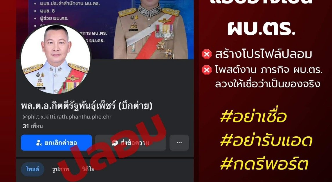 ⚠️ อย่าเชื่อ อย่ารับแอด กดรีพอร์ต “บัญชีเฟซบุ๊กปลอม” แอบอ้าง เป็น ผบ.ตร.