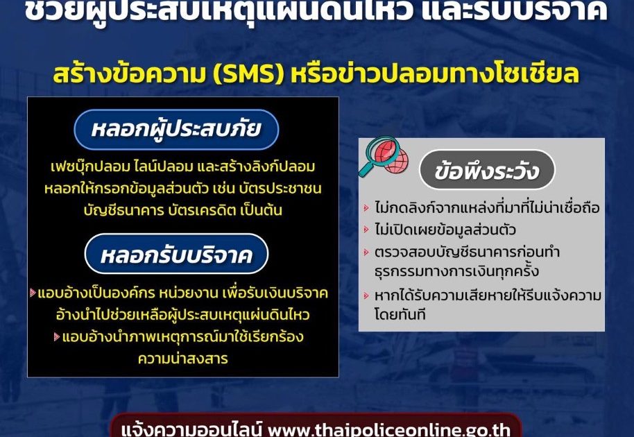 จากสถานการณ์ภัยพิบัติแผ่นดินไหวที่เกิดขึ้นในประเทศไทย ขณะนี้หน่วยงานภาครัฐและเอกชนกำลังเร่งให้ความช่วยเหลือผู้ประสบเหตุอย่างเต็มที่ อย่างไรก็ตาม ขอให้ประชาชนเพิ่มความระมัดระวัง เนื่องจากอาจมีกลุ่มมิจฉาชีพฉวยโอกาสก่อเหตุหลอกลวงในรูปแบบต่างๆ