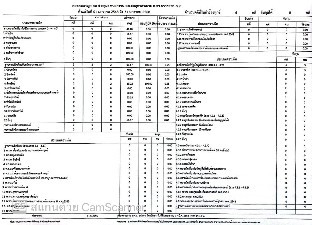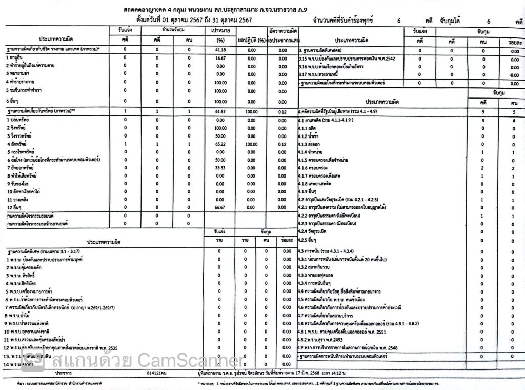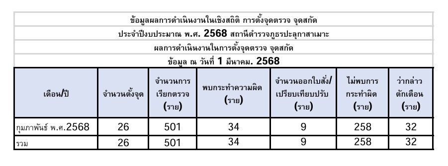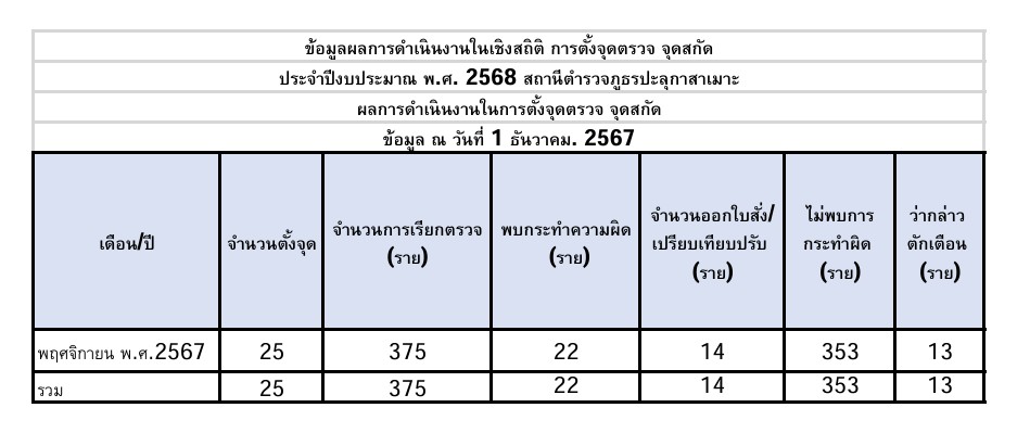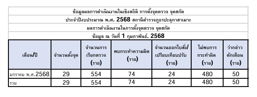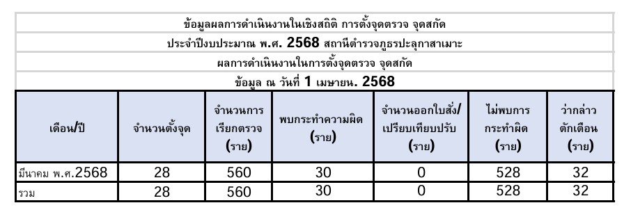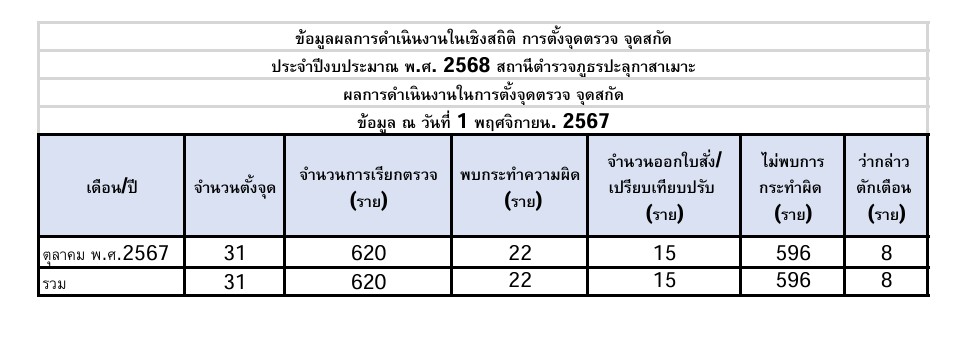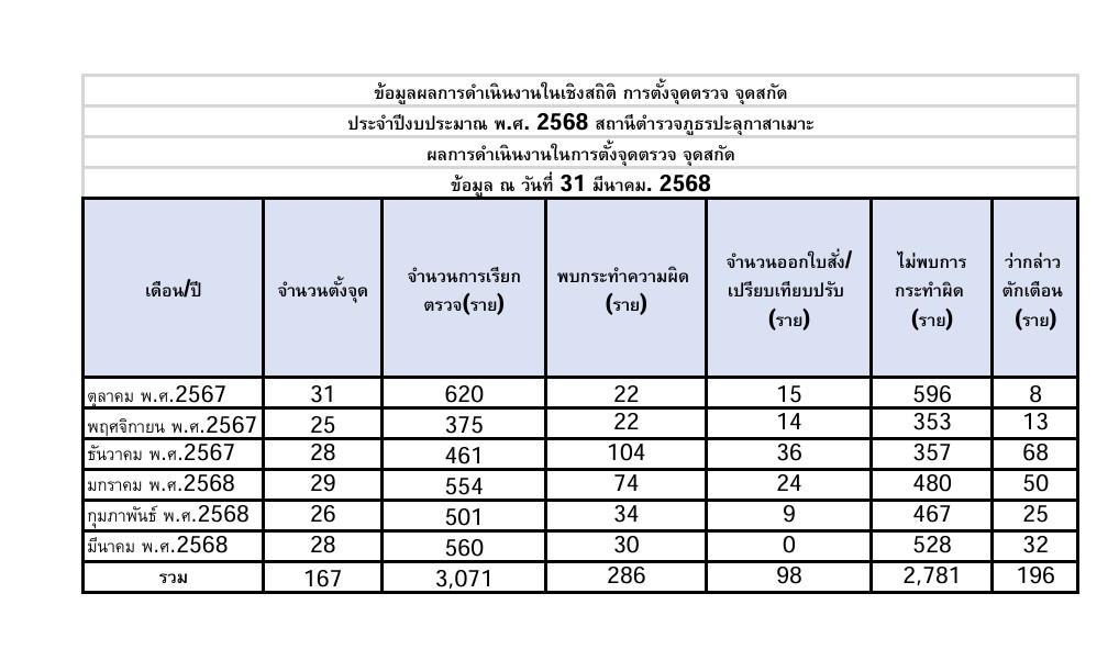 ข้อมูลการดำเนินงานเชิงสถิติการตั้งจุดตรวจ จุดสกัด เดือน ตุลาคม 2567 - มีนาคม 2568